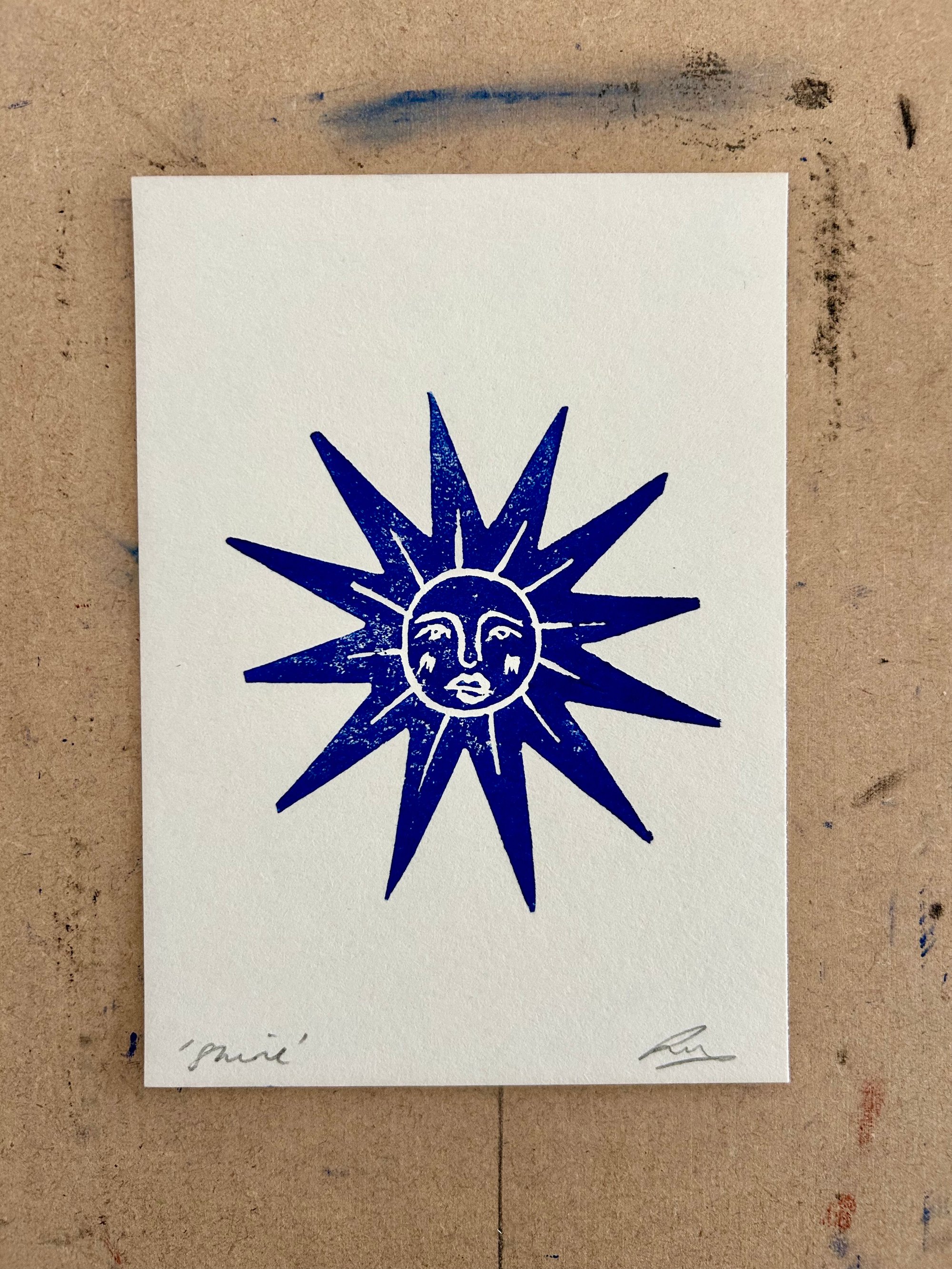 Original handcut Lino Cut Print on Natural white acid free 180gsm paper. Printed with Prussian blue, Schminke ink. Approximately A6 in size